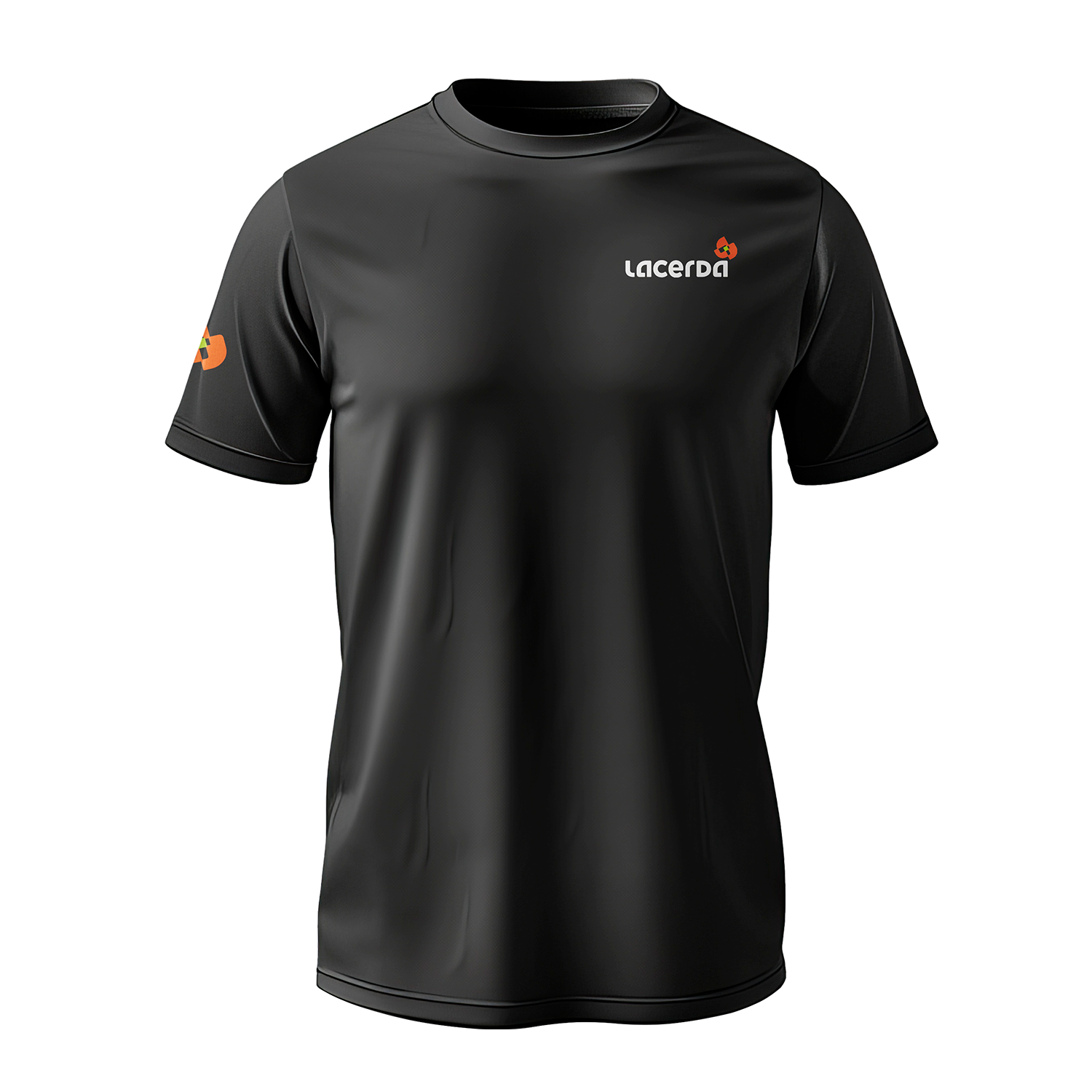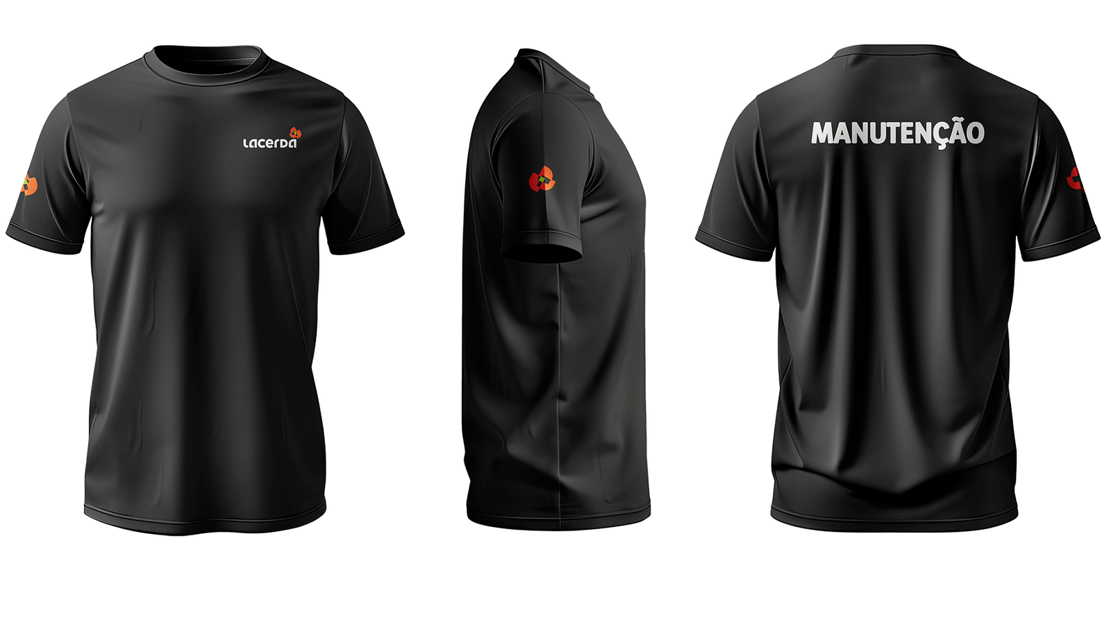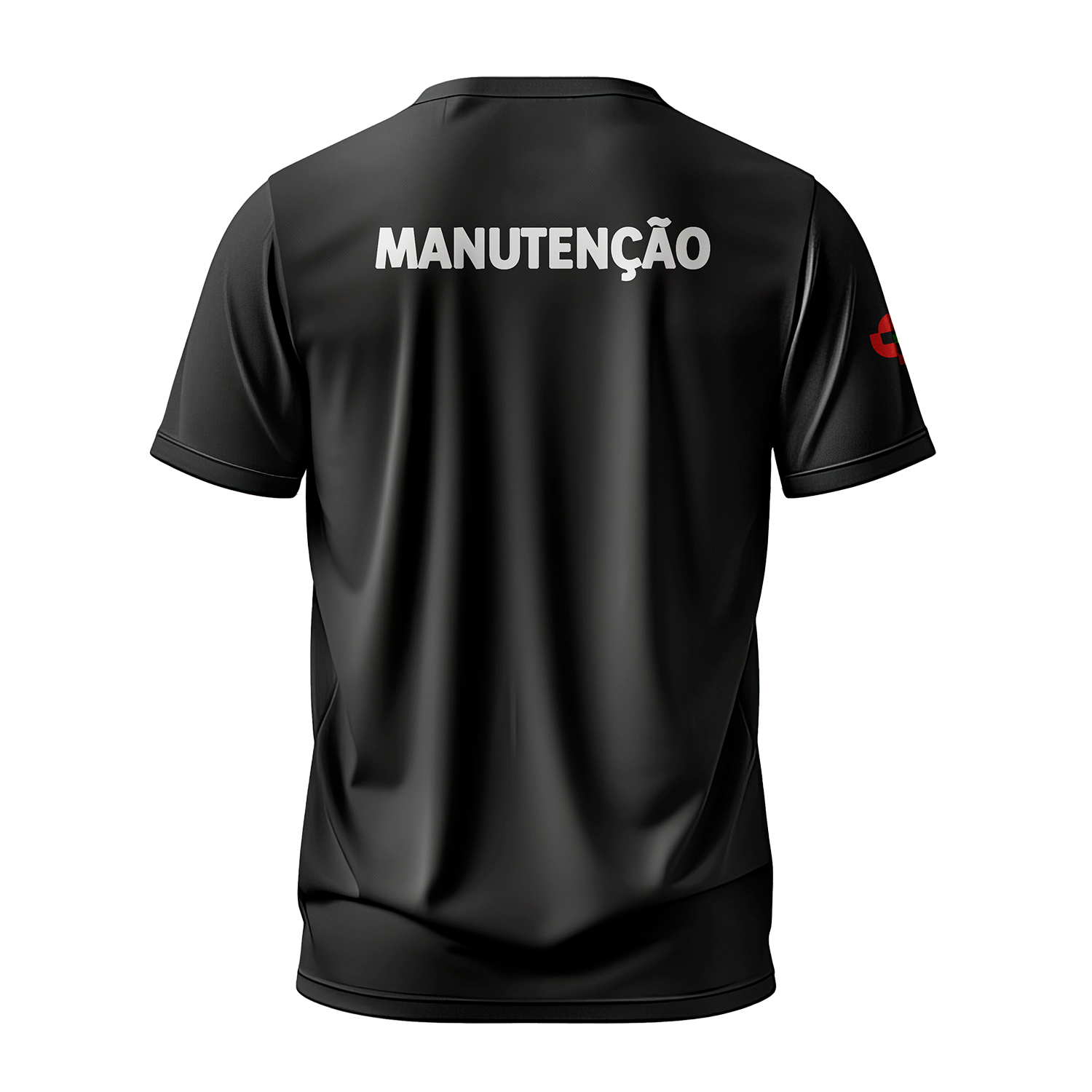Blusa em malha PV preta com silk no peito de 10×3,33cm, na manga direita de 4×4 cm e nas costas 15×4,5cm